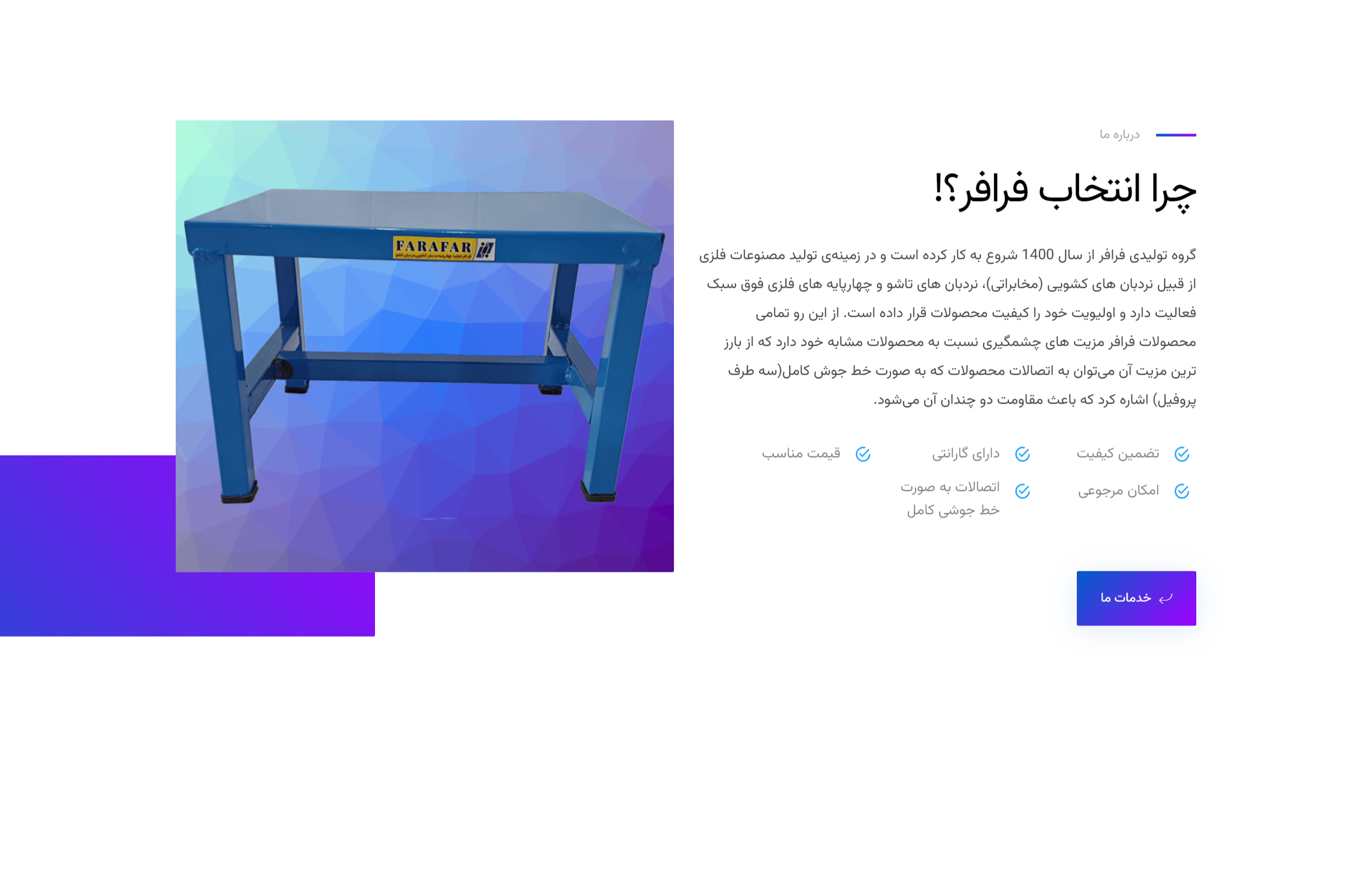 با افتخار سایتی را برای شرکت تولیدی نردبان فرافر صنعت ارئه داده ایم . این سایت با هدف به نمایش گذاشتن محصولات و خدماتشان مانند ساخت بهترین نردبان های کشویی (مخابراتی) ، نردبان های تاشو و چهار پایه های اهنی مقاوم طراحی و ساخت شده است .